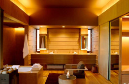 8 Suites reparties dans le bâtiment principal, avec air conditionné et lit king-size, coin salon avec sofa, poêle traditionnel, et salle de bains ouverte avec douche et baignoire, coffre-fort.