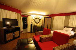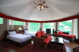 Le lodge est composé de seulement 12 tentes de luxe de 45 m2 dans le style de ceux qu’on rencontre en Afrique. Les tentes sont réparties de part et d’autre des parties communes. Chaque tente comprend une terrasse ombragée équipée de chaises longues et, à l’intérieur, ventilateur, TV écran plat, accès internet Wi-Fi, minibar, salle de bain avec baignoire-douche.