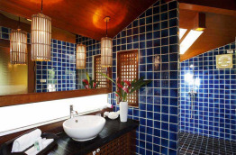 Villa Deluxe Executive : chambre de 140 m2 avec téléviseur LCD, lecteur DVD, salle multimédia, grande salle de bains avec baignoire en pierre, petite piscine privée à l'abri des regards indiscrets, deuxième salle de bains avec douche et toilettes, vue sur la piscine privée.