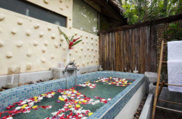 Villa Deluxe de 76 m? avec TV LCD, lecteur DVD, espace salon, immense salle de bains avec baignoire en pierre, douche séparée avec effet de pluie et petite piscine privée entourée d'un mur décoratif, vue sur la piscine privée.