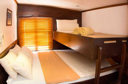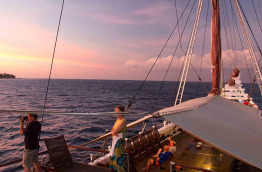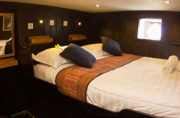 Ce bateau a été construit en 1995 à Kalimantan sur le format d’un « phinisi », un voilier traditionnel indonésien à 2 mâts se caractérisant par une forme élancée. Le Katharina mesure 40 m de long et possède 6 cabines confortables situées sur le pont inférieur. Elles peuvent accueillir jusqu’à 14 passagers et comptent 2 cabines équipées d’un lit double, 2 cabines équipées de lits jumeaux superposés et 3 cabines équipées d’un lit double et d’un lit simple superposé. Le Katharina présente également un pont supérieur avec solarium et un pont principal composé d’une salle à manger extérieure, d’un bar et d’un espace détente. Toutes les cabines disposent de l’air conditionné, d’une salle de bains privée avec toilettes et douche, d’un coffre-fort et d’un espace de rangement. Elles sont élégantes, chaleureuses, aménagées avec du mobilier en bois et décorées selon le style traditionnel local. L’équipage se compose de 13 membres. Un téléviseur ainsi qu’une sélection de DVD et une chaîne Hi-Fi sont à votre disposition dans le « lounge ». Les serviettes de toilette et de plage sont mises à votre disposition à bord.