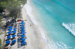 Pour accéder à la plage, vous devez traverser la petite route de sable qui fait le tour de l’île. Vous serez directement les pieds dans le sable, à profiter d’une chaise longue, à siroter un verre au bar de l’hôtel, ou à prendre un repas au restaurant.