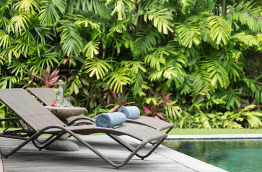 Les Two-Bedroom Pool Villas sont les catégories les plus spacieuses, avec environ 270 m2. Elles se composent de deux pavillons distincts. Le premier possède deux chambres avec dressing et salles de bains attenantes. Le second présente une salle à manger avec kitchenette et un salon extérieur. La grande terrasse extérieure, équipée de chaises longues, vous donne accès à une piscine privative.