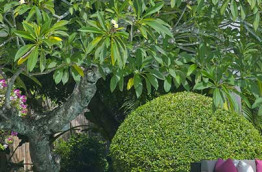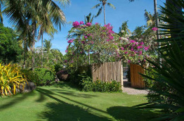 La propriété, qui s’étend du bord de plage jusqu’à l’intérieur des terres, est bordée par de grands murs végétaux. Les jardins sont magnifiquement composés et entretenus, mélangeant cocotiers immenses, rocailles tropicales, superbes bougainvilliers : l’ensemble est très beau et reposant.