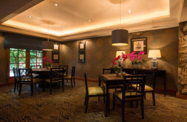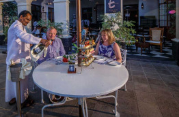 La salle de réception, d’inspiration coloniale elle aussi, est située en rez-de-jardin. Ainsi on peut admirer les fleurs et les arbres qui entourent l’hôtel, tout en consommant son repas. Enfin, si la météo le permet il est possible de se restaurer en extérieur, sur la pelouse anglaise de l’hôtel.