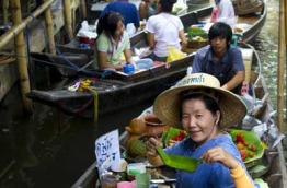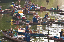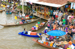 Départ très matinal pour rejoindre la ville de Damnoen Saduak, située au Sud-Ouest de Bangkok, à environ 1 heure de route. Il est important d’arriver tôt pour profiter au maximum du lieu. À votre arrivée, vous embarquerez à bord d'un petit bateau sampan pour partir à la découverte du marché flottant qui se tient quotidiennement dans cette localité. Laissez-vous porter dans votre embarcation, au fil des canaux de Damnoen Saduak, et rejoignez la population qui s'affaire déjà sur les berges et sur l'eau. Les bateaux des locaux sont chargés de fruits et de légumes, certains cuisinent même à bord et livrent leurs produits vers les autres sampans qui circulent aux alentours. Ils s'approchent des berges, déposent des produits vers les maisons qui bordent les canaux. C'est un va-et-vient permanent haut en couleur, une expérience dépaysante et pleine de charme.