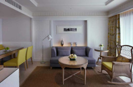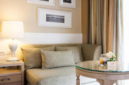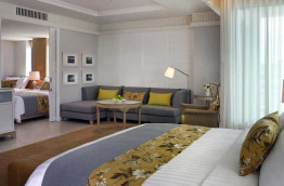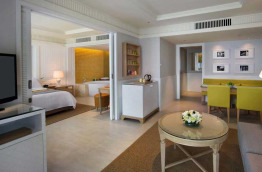 Les 3 One Bedroom Suites Pool View offrent des superficies de 77 m2 à 88 m2. Elles présentent une chambre et un salon séparé. La chambre est équipée d'un lit double et s'ouvre sur une salle de bains avec baignoire. Le salon dispose d'un canapé, d'une table basse et d'une table pour les repas. Le balcon est orienté vers la piscine.